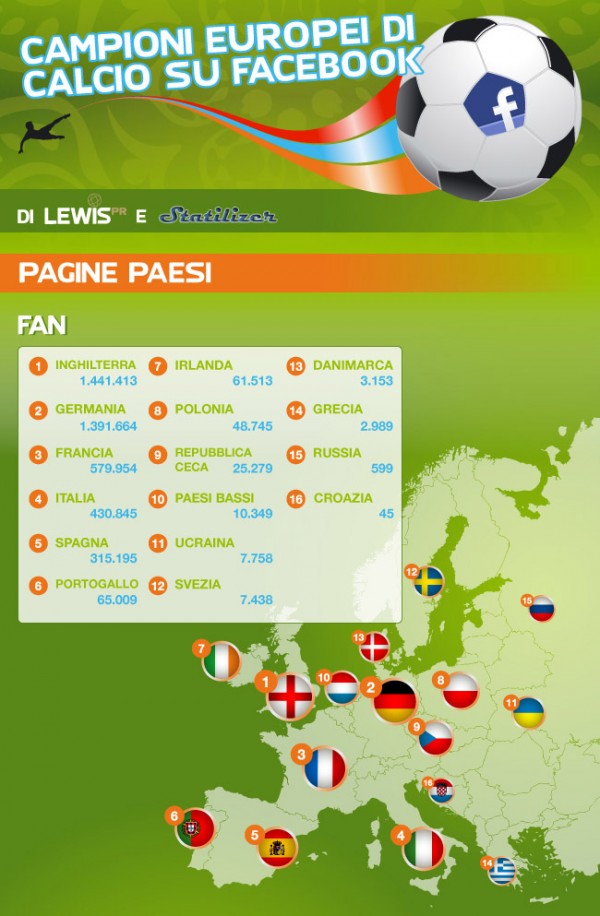 Facebook unisce ma qualche volta divide. È successo agli esordi di Euro 2012, quando i ct di alcune famose nazionali hanno proibito l’uso dei social network ai loro giocatori. In questo ambito la nazionale italiana viaggia alta in classifica. Secondo la ricerca di Lewis PR, agenzia di comunicazione digitale, infatti, gli azzurri conquistano la quarta piazza per numero di fan, una medaglia di legno che vale 430 mila amicizie ma che è distante anni luce dal milione e 400 mila della prima classificata Inghilterra e dal milione e 300 mila della seconda classificata Francia. In quanto a percentuale di partecipazione l’Italia fa molto peggio, scalando al quattordicesimo posto nella classifica delle community più attive, che è dominata dalla Russia.